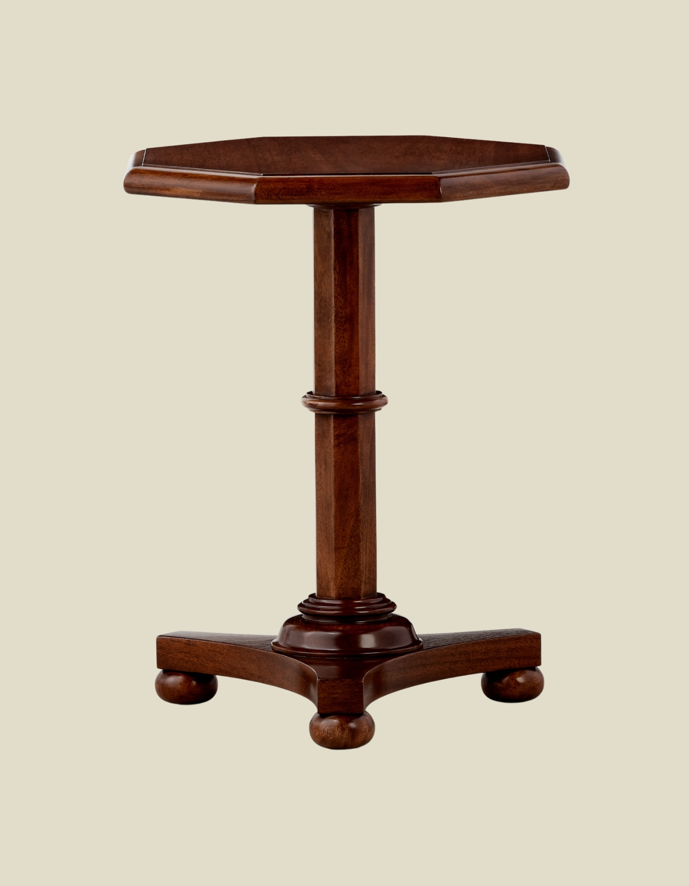 This versatile accent table is crafted from solid wood with a hand-applied finish that imparts rich dimension. Resting on classic bun feet with a tripod base, the pillar and top are defined by distinct octagonal contours.