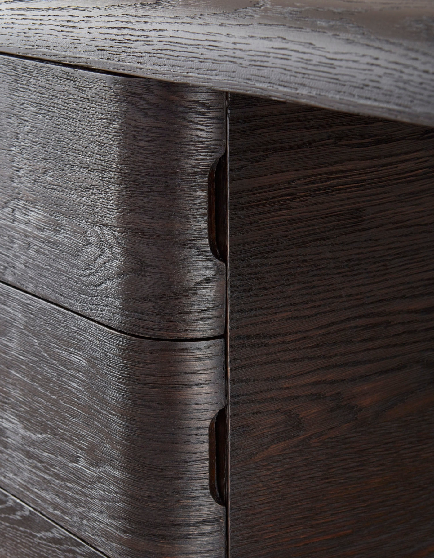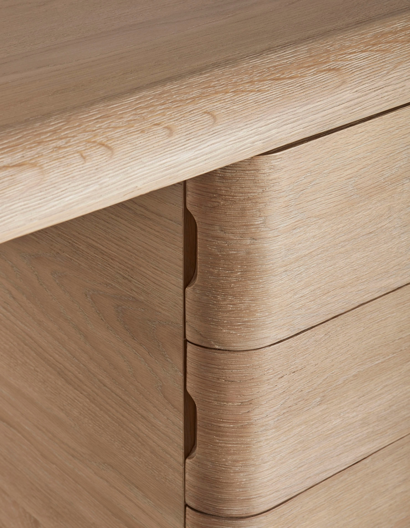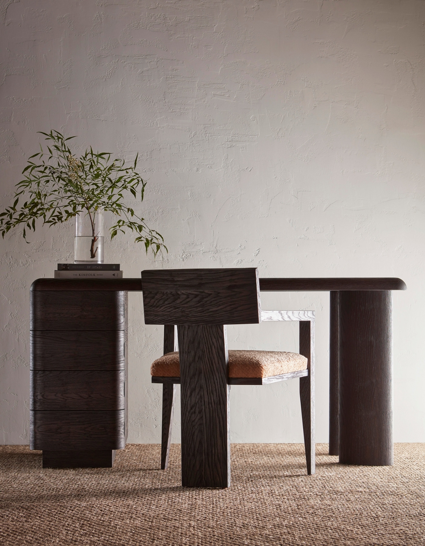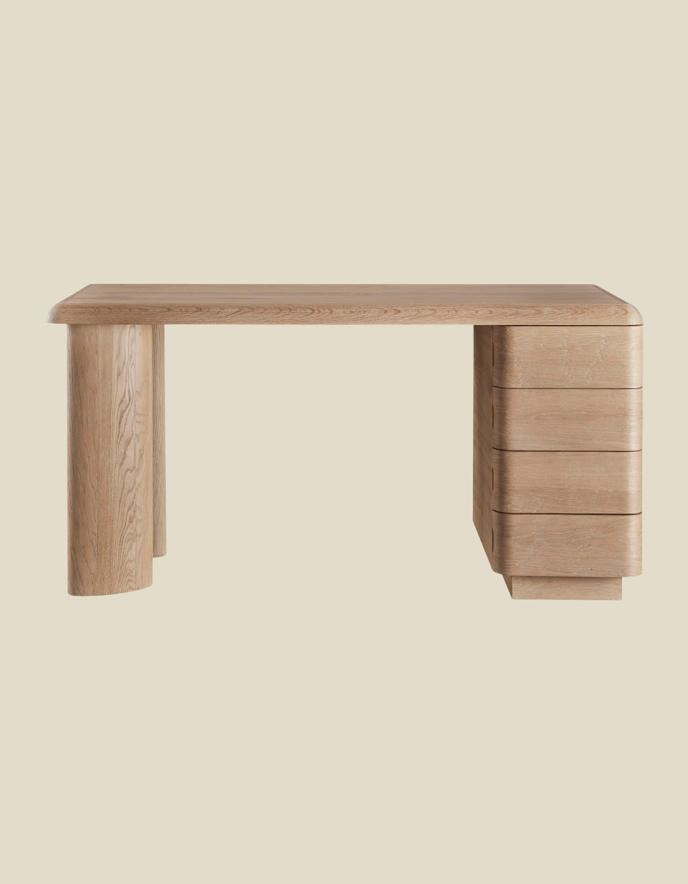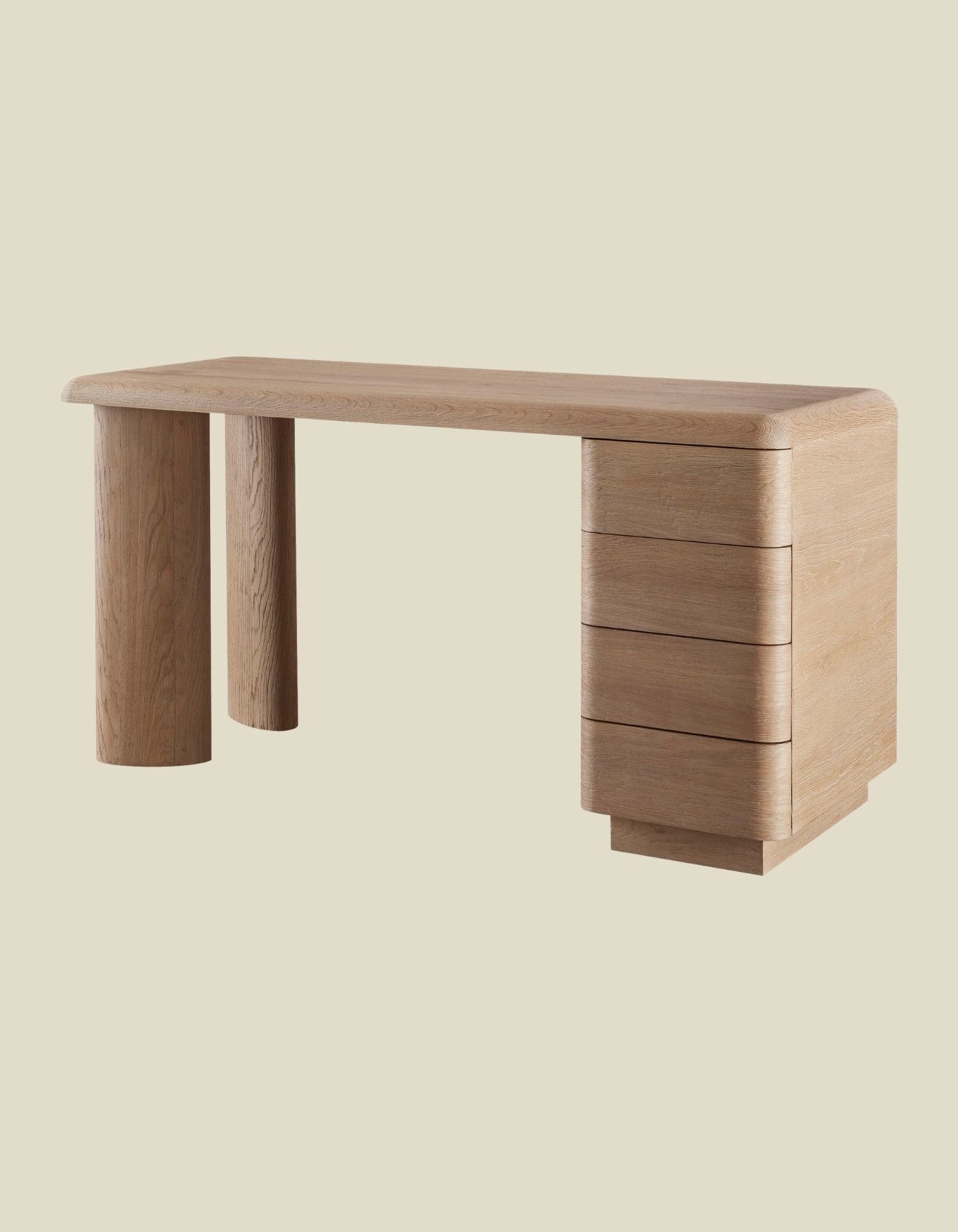 Crafted from sandblasted oak, the Column Desk has a raw and refined spirit. The desk is geometric in form with organic rounded edges, angled and inset legs and a column of four drawers. Available in left facing or right facing orientation.