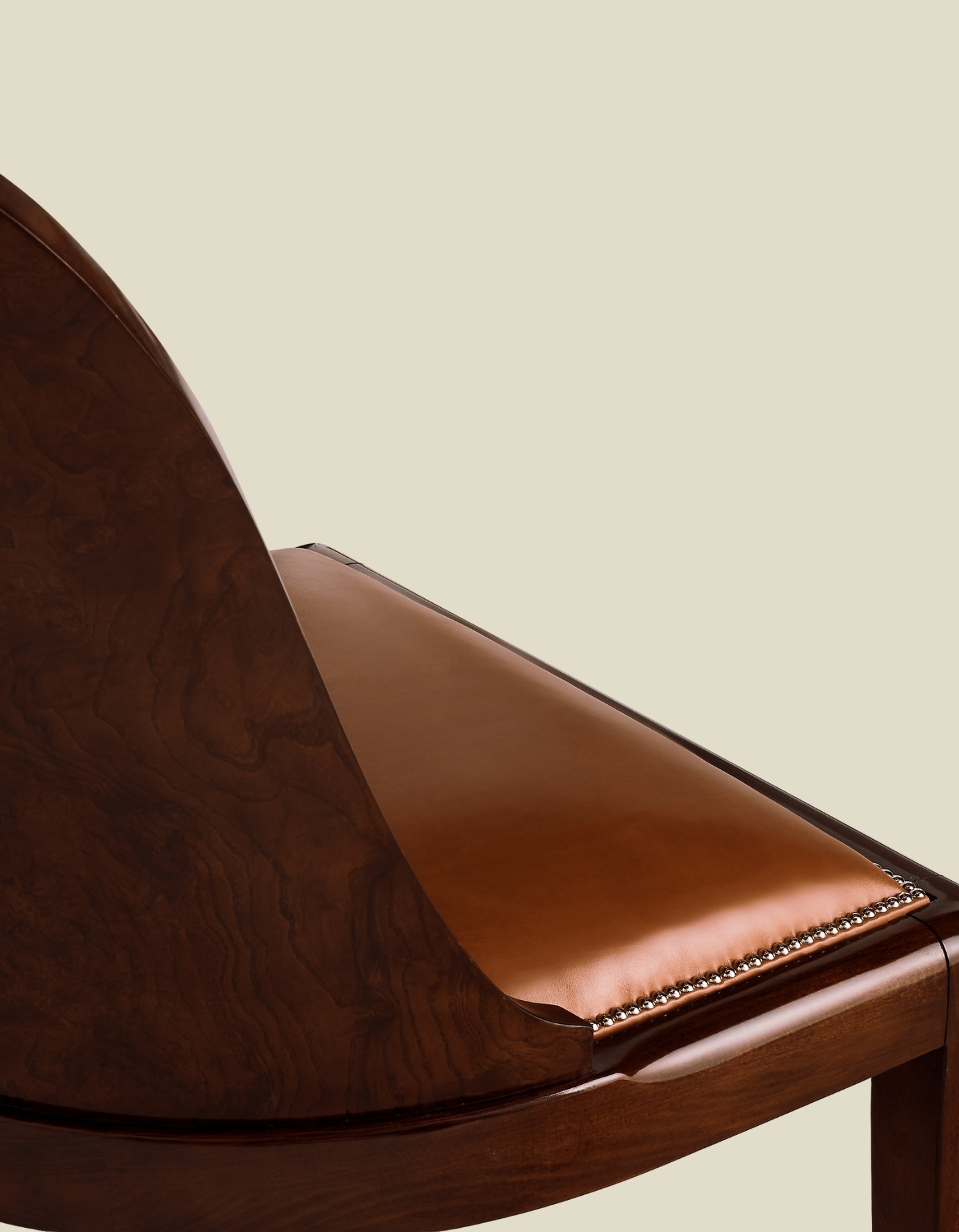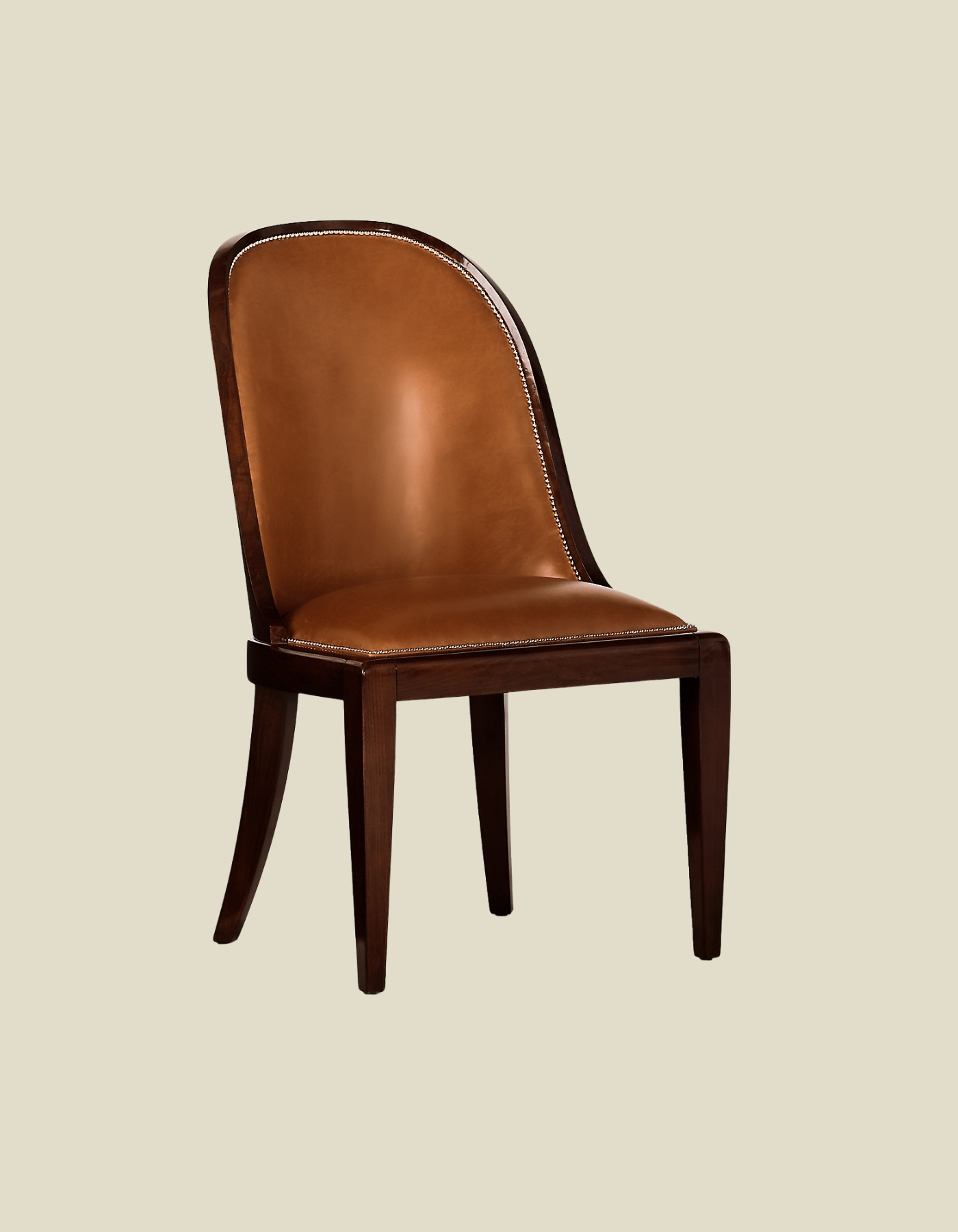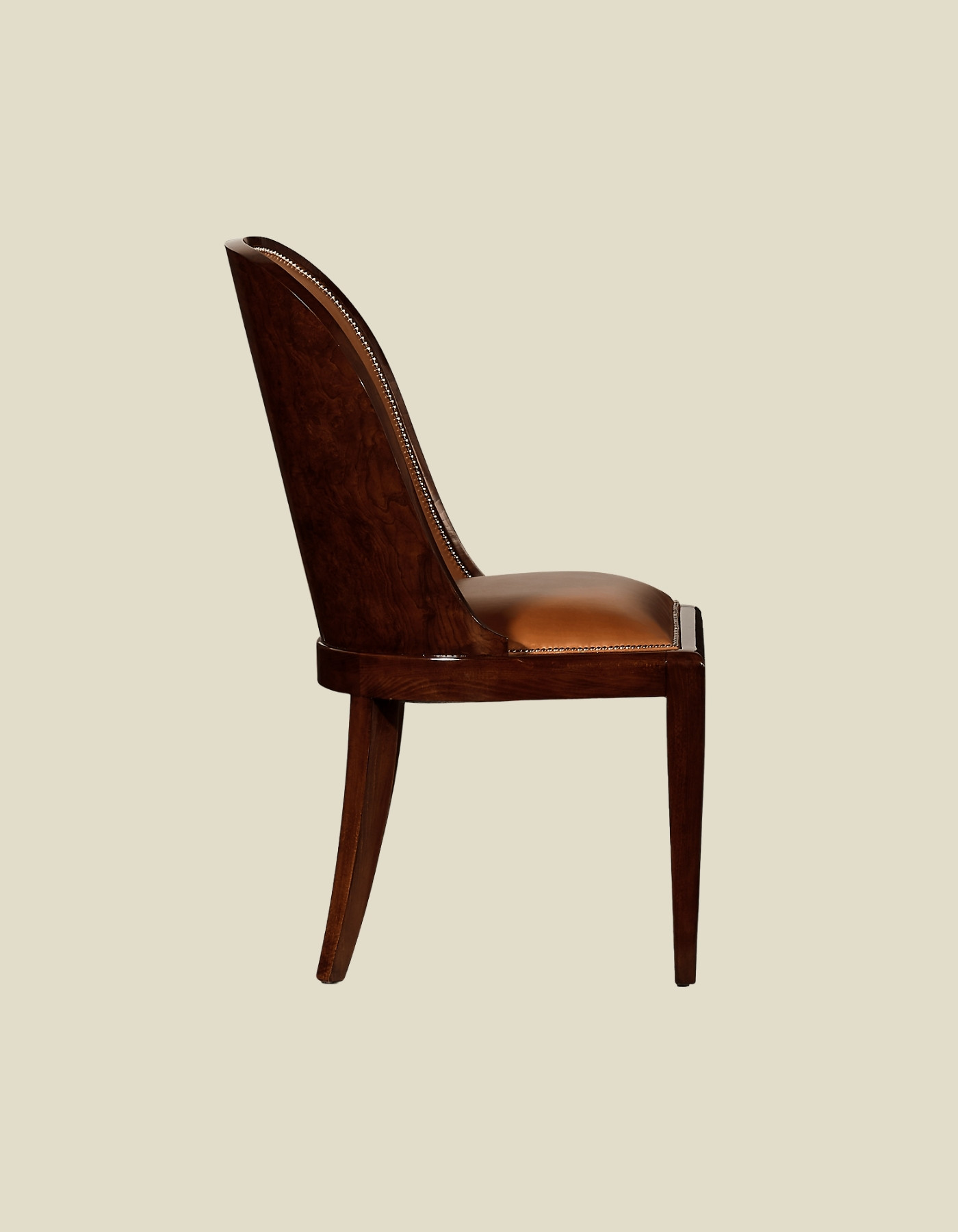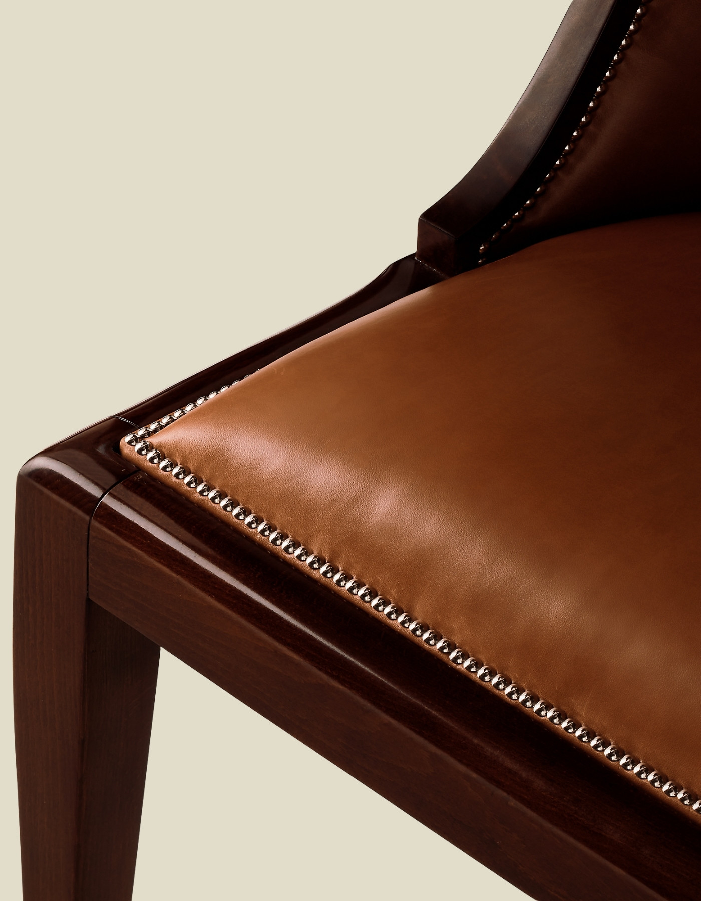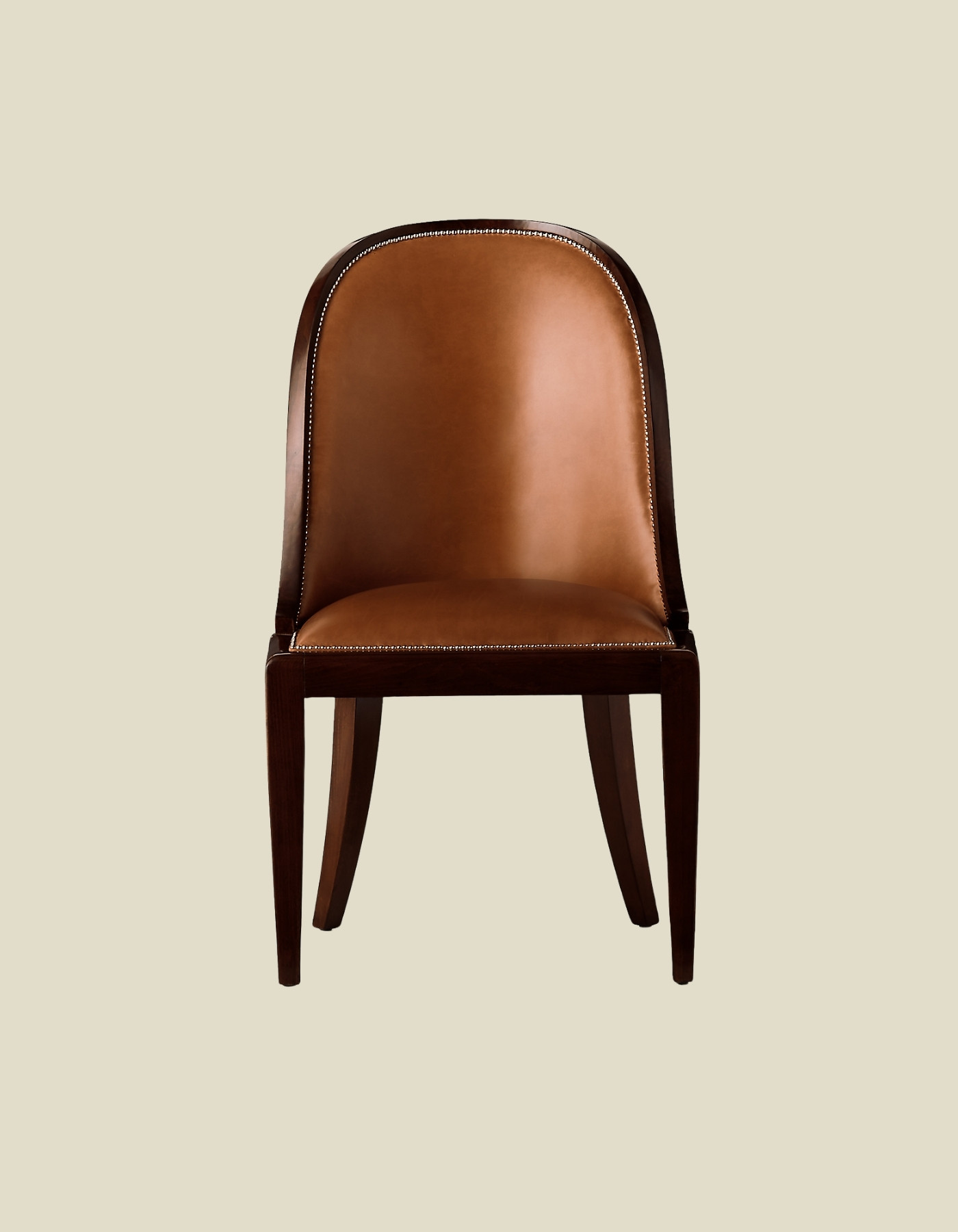 The elegant sloped seat back of Ralph Lauren’s Cutler Dining Chair is masterfully crafted from solid wood and trimmed with delicately scaled nailheads.