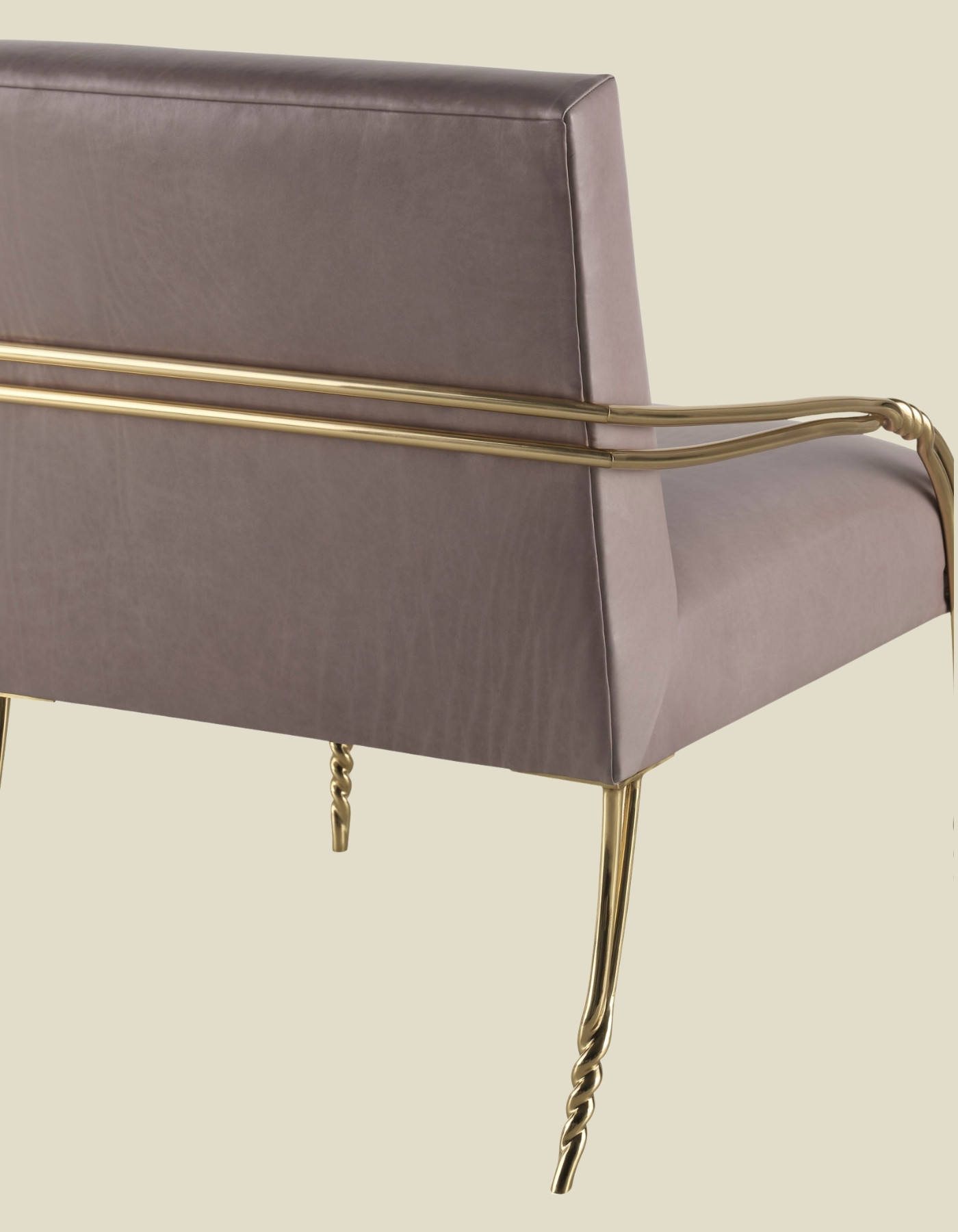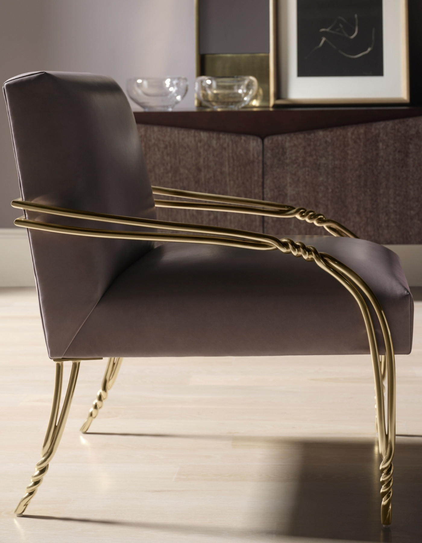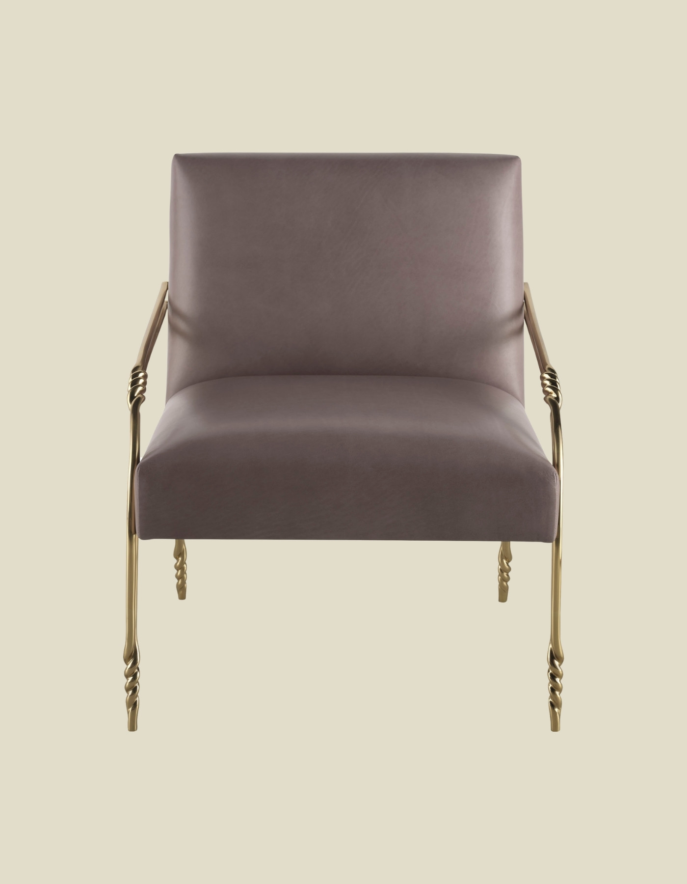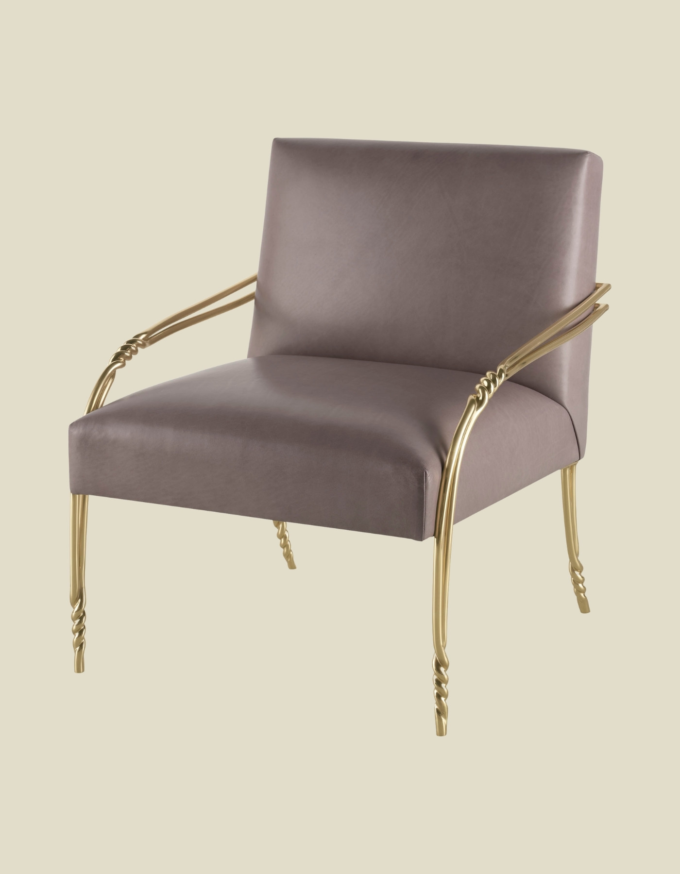 The Mila Chair boasts uniquely twisted arms and legs that beckon a closer look, just as the eye is drawn to shimmering earrings and bracelets. The frame of this spirited, feminine chair is crafted in solid Brass.