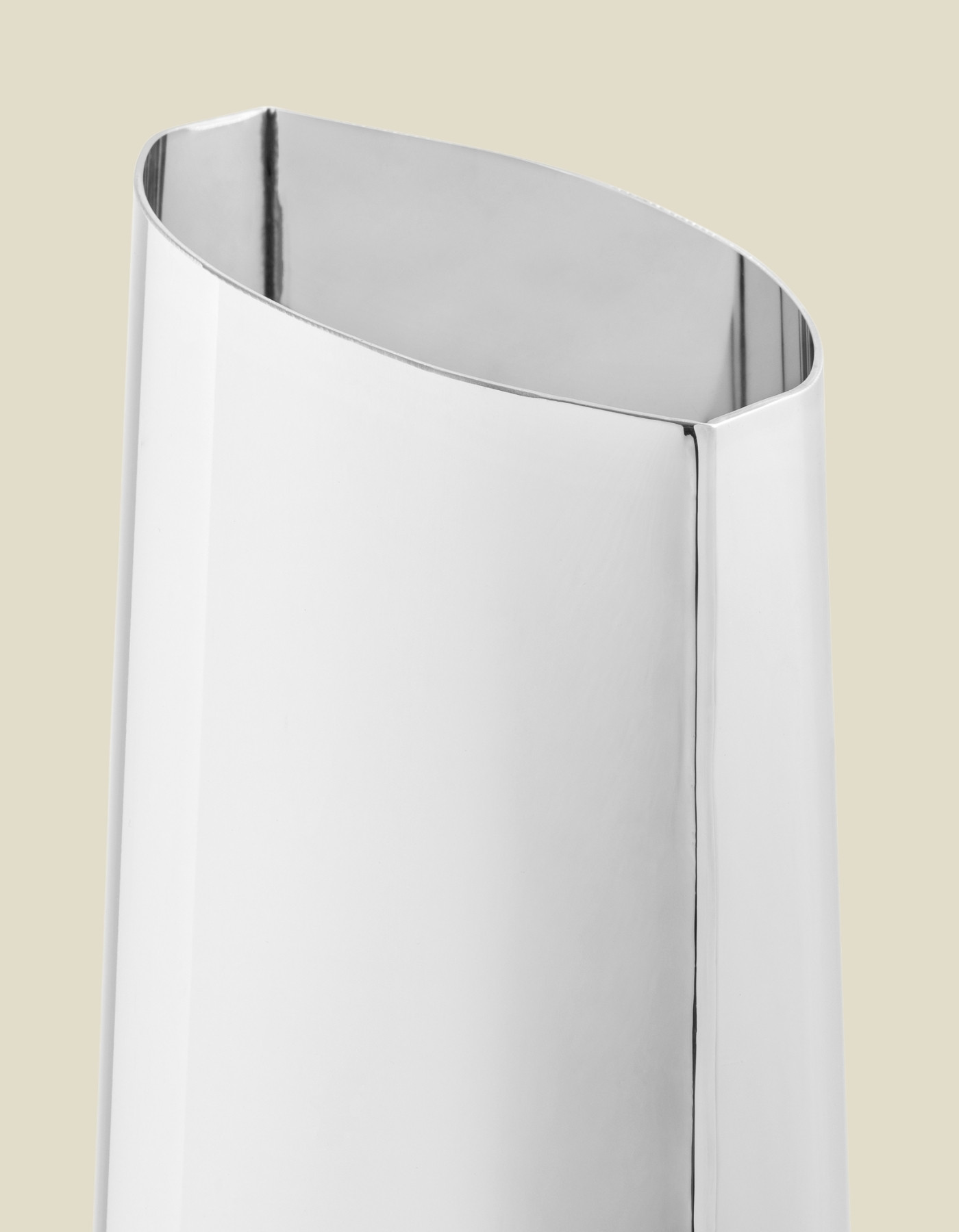 Fashioned in stainless steel, the crescent-shaped Parova Vase is crisply silhouetted in gleaming metal. Its sharply drawn diagonal opening at the top provides contrast against the rounded form.