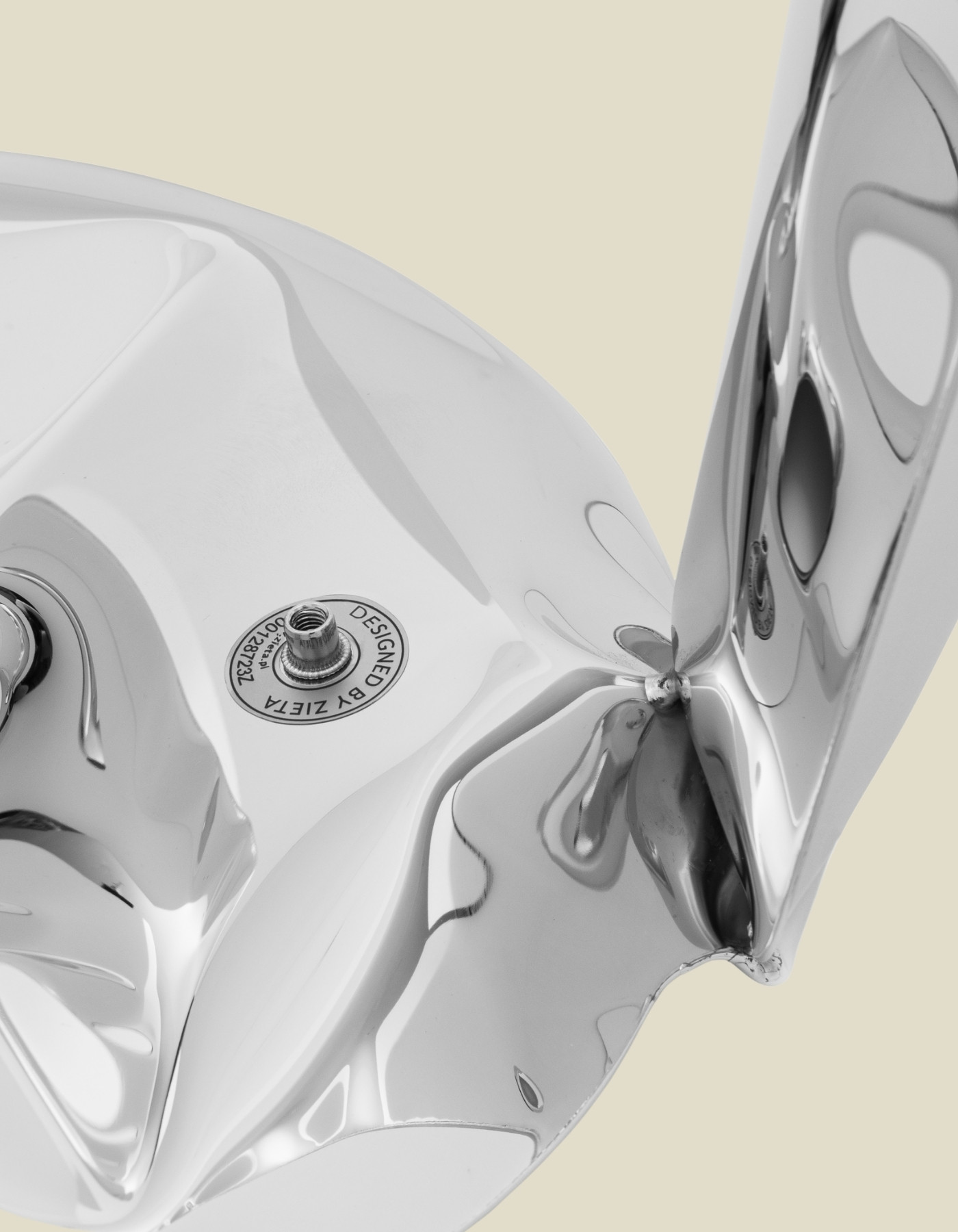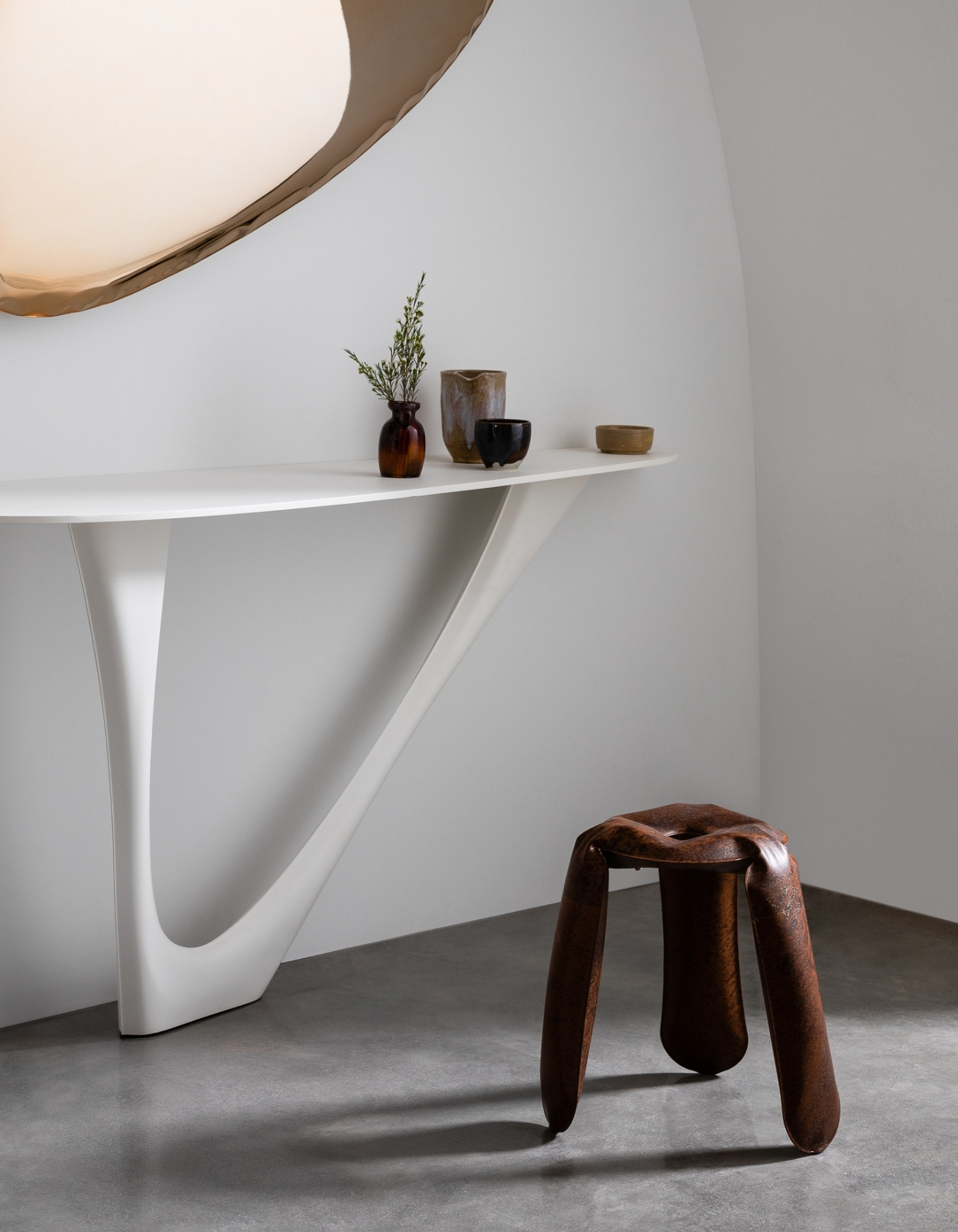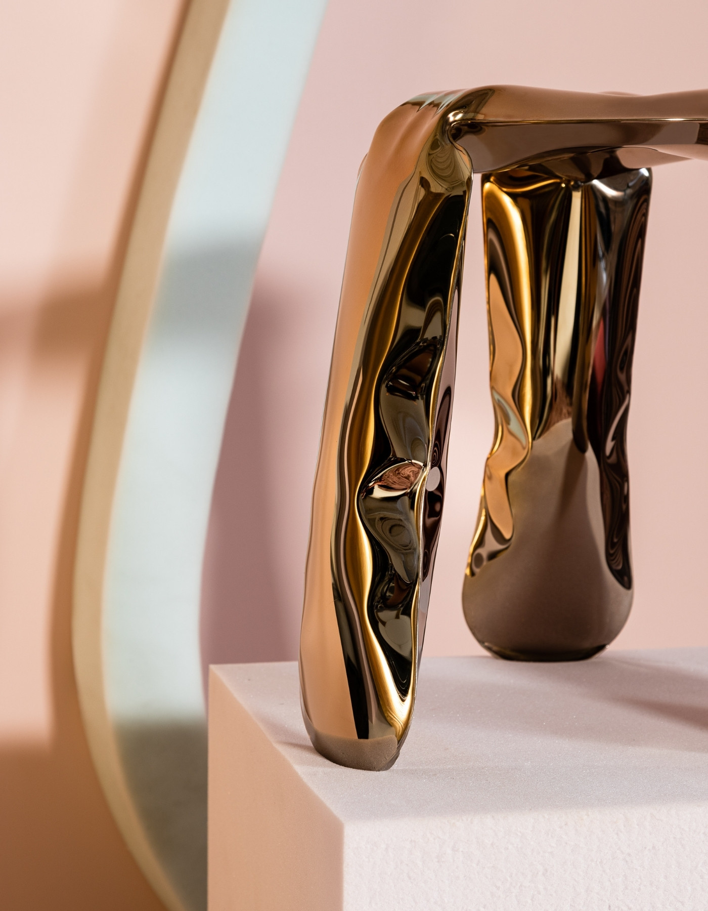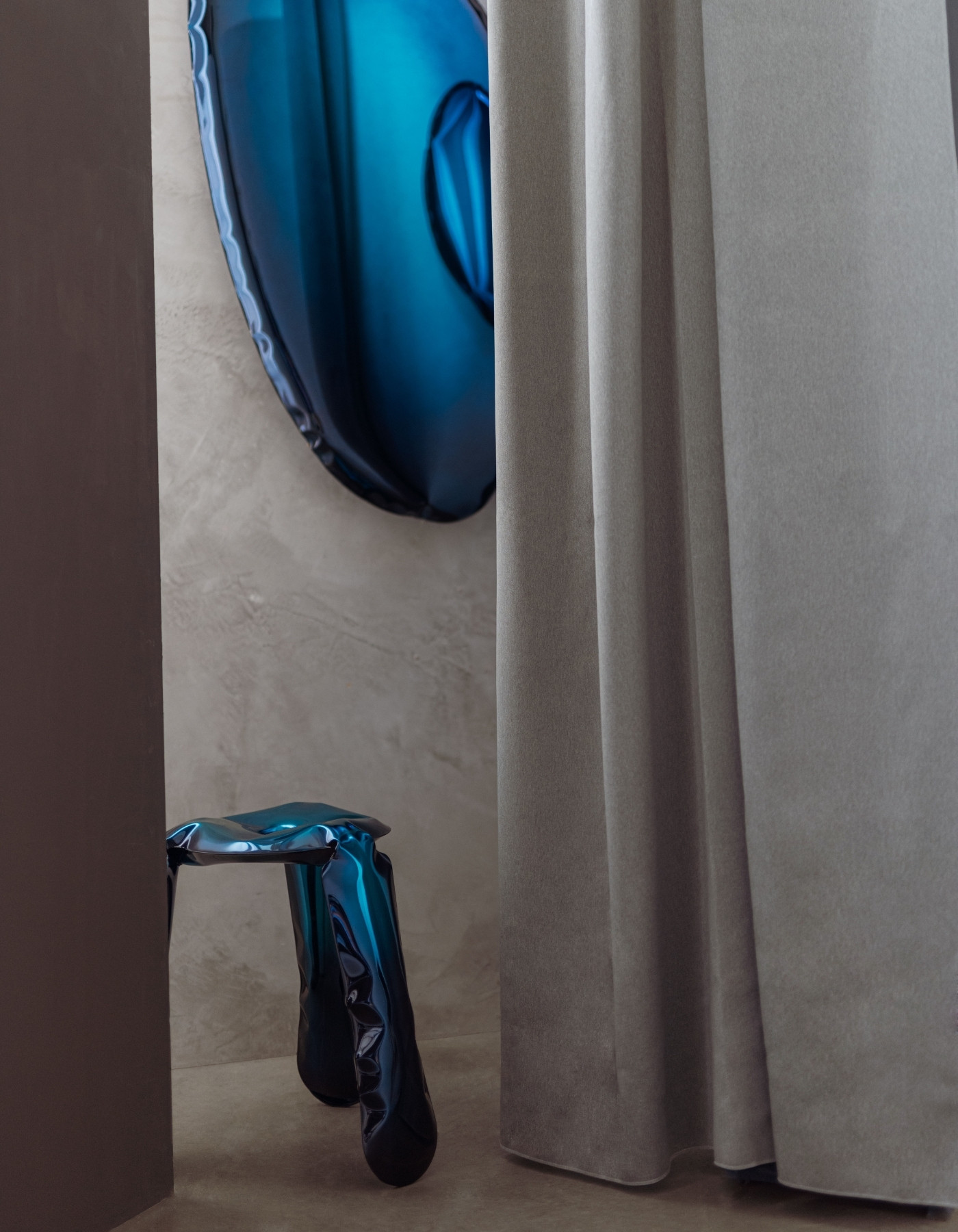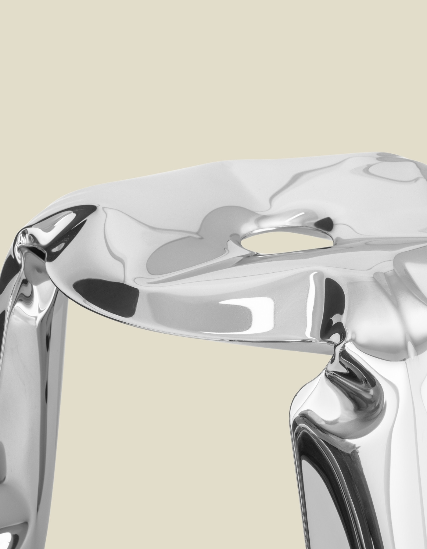 Plopp is a manifesto of the FiDU technology and the “controlled loss of control” process. Two ultra-thin steel sheets are welded together around their edges and inflated under high pressure, deforming a 2.5D flat form into a 3D object. Ultra lightweight and extremely sturdy, Plopp can withstand a load of 2.5 tonnes.