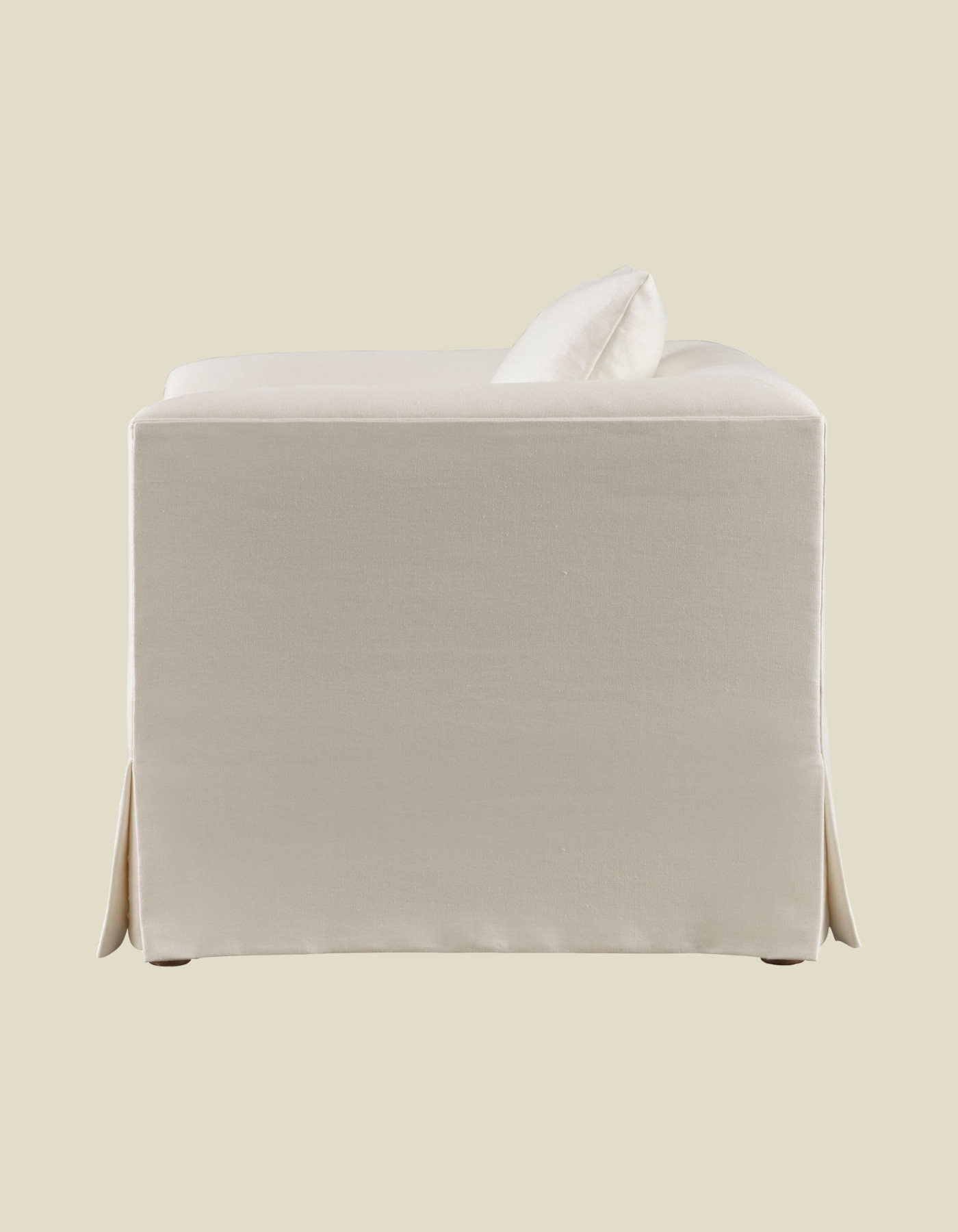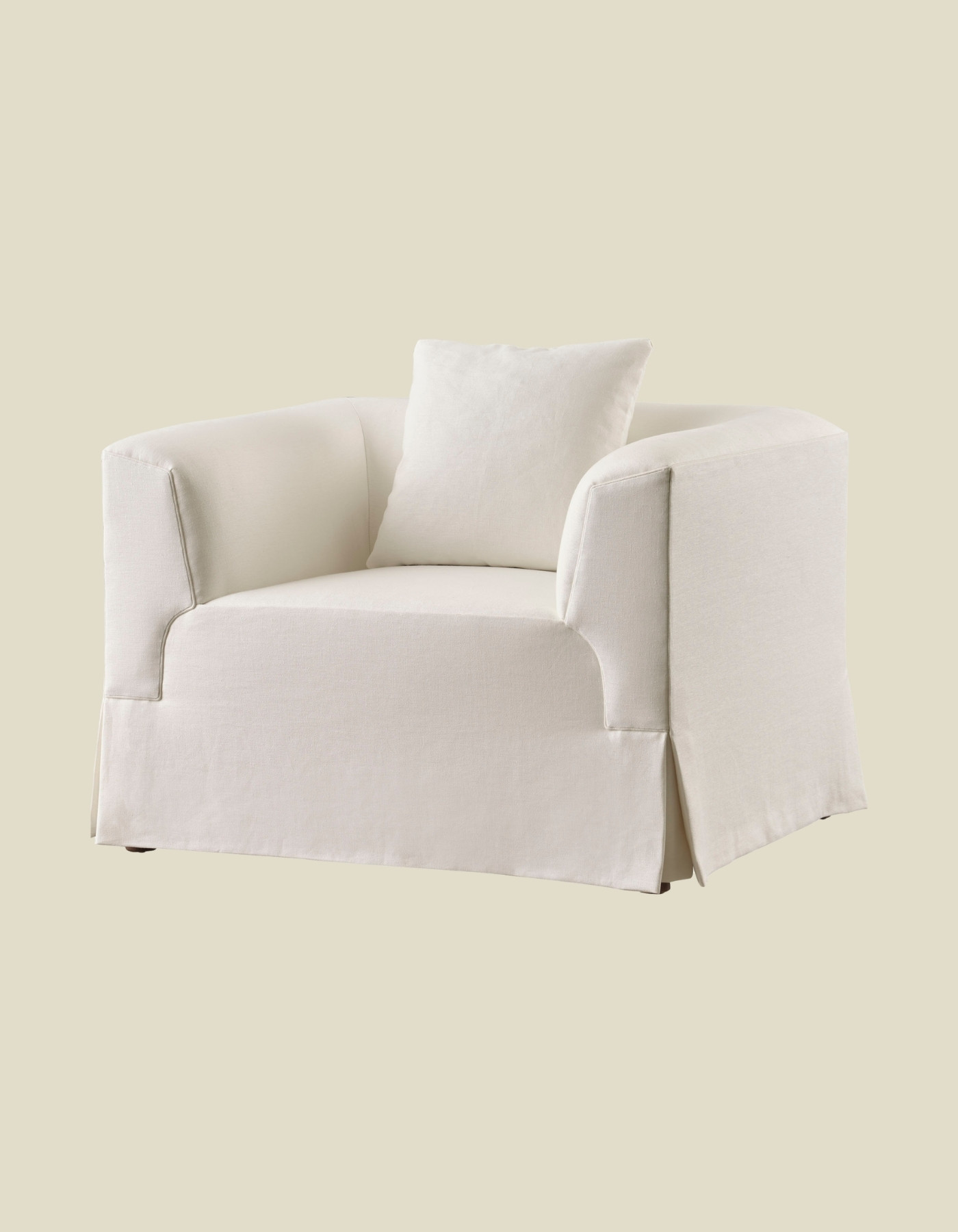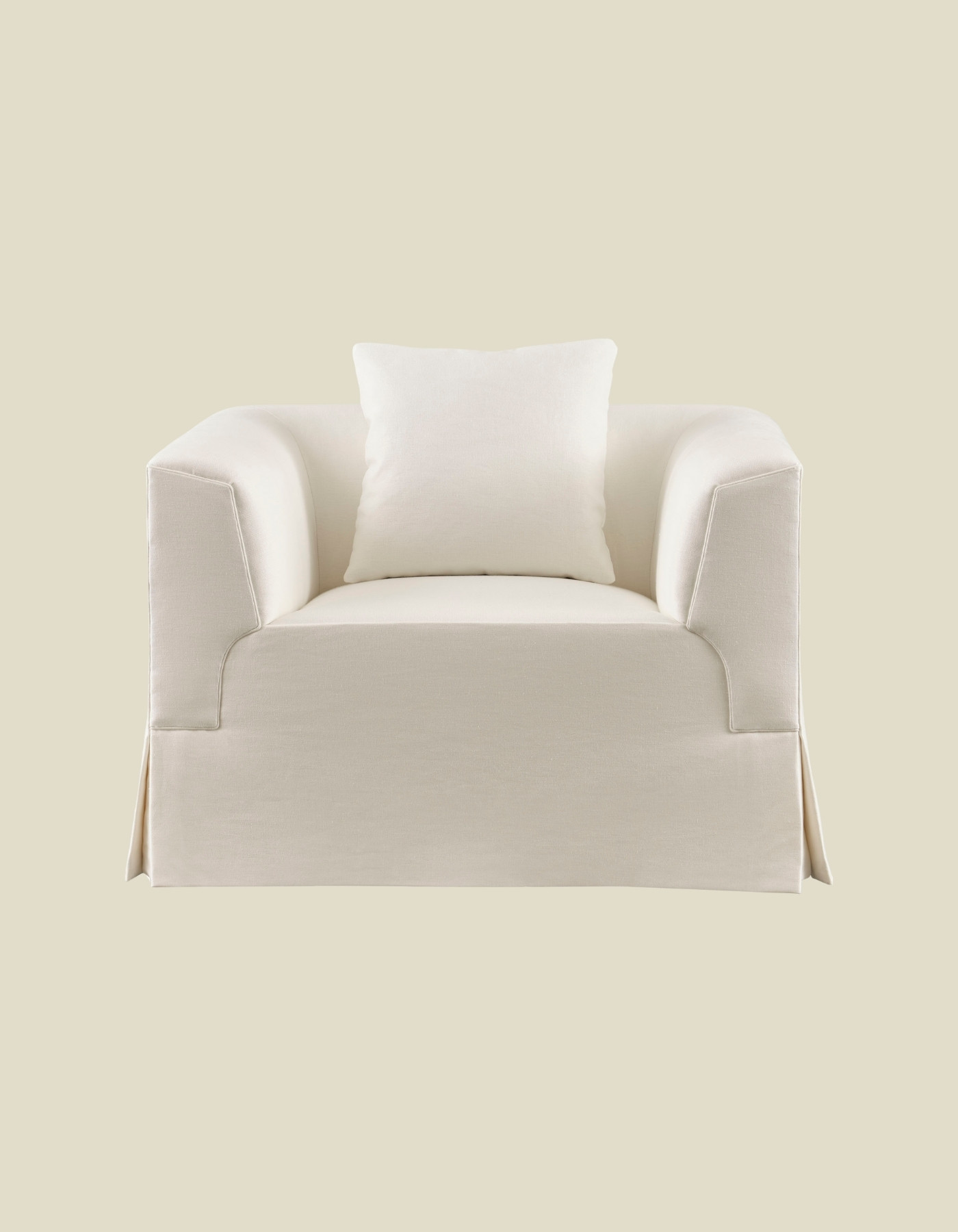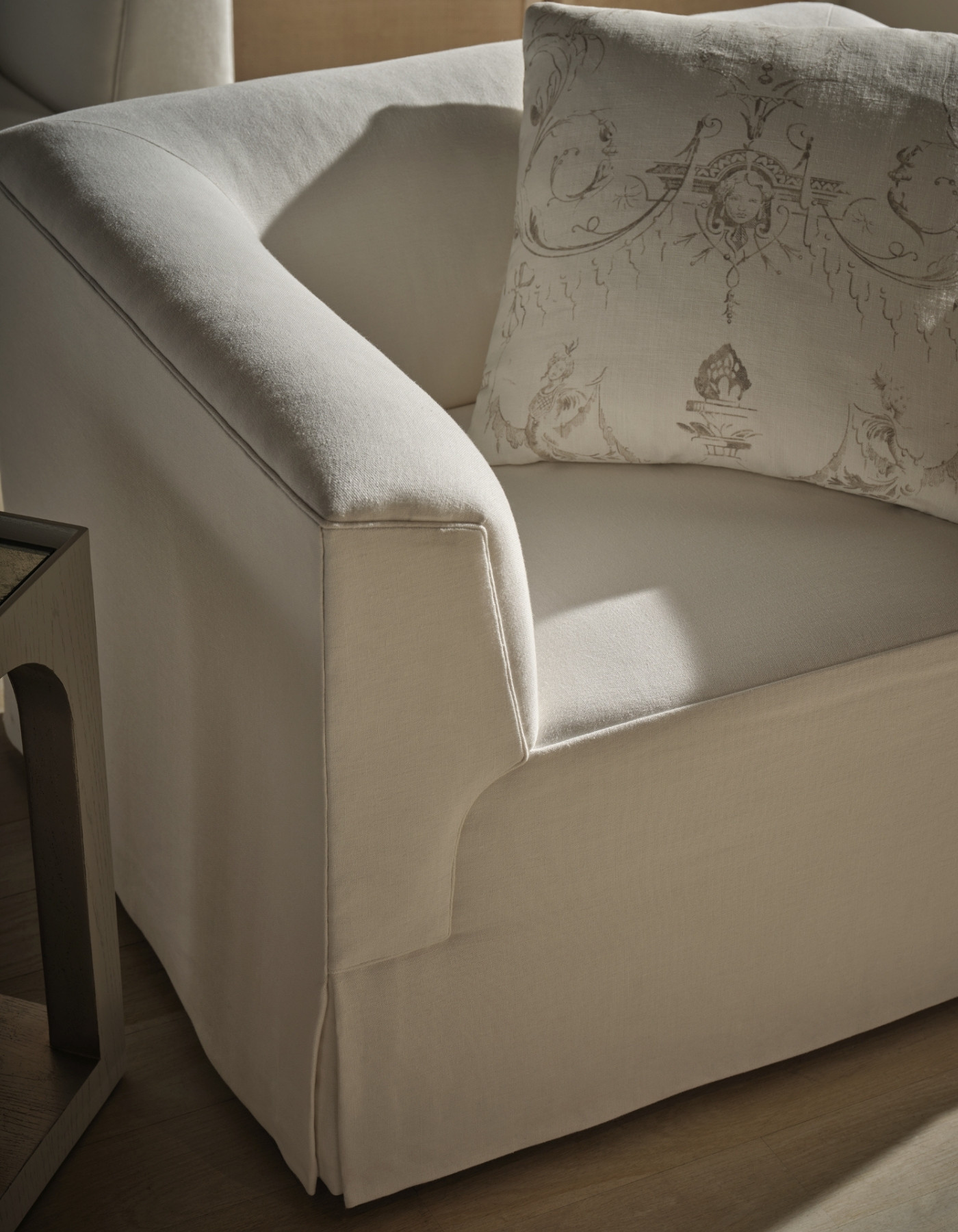 Capturing the casual elegance of provincial styling, the Province Chair graces your room with a low-profile, generous scale and a fully upholstered dressmaker skirt. With a tight seat and back, the Province Chair includes one Baker Comfort Plush knife-edge throw pillows (45cm).