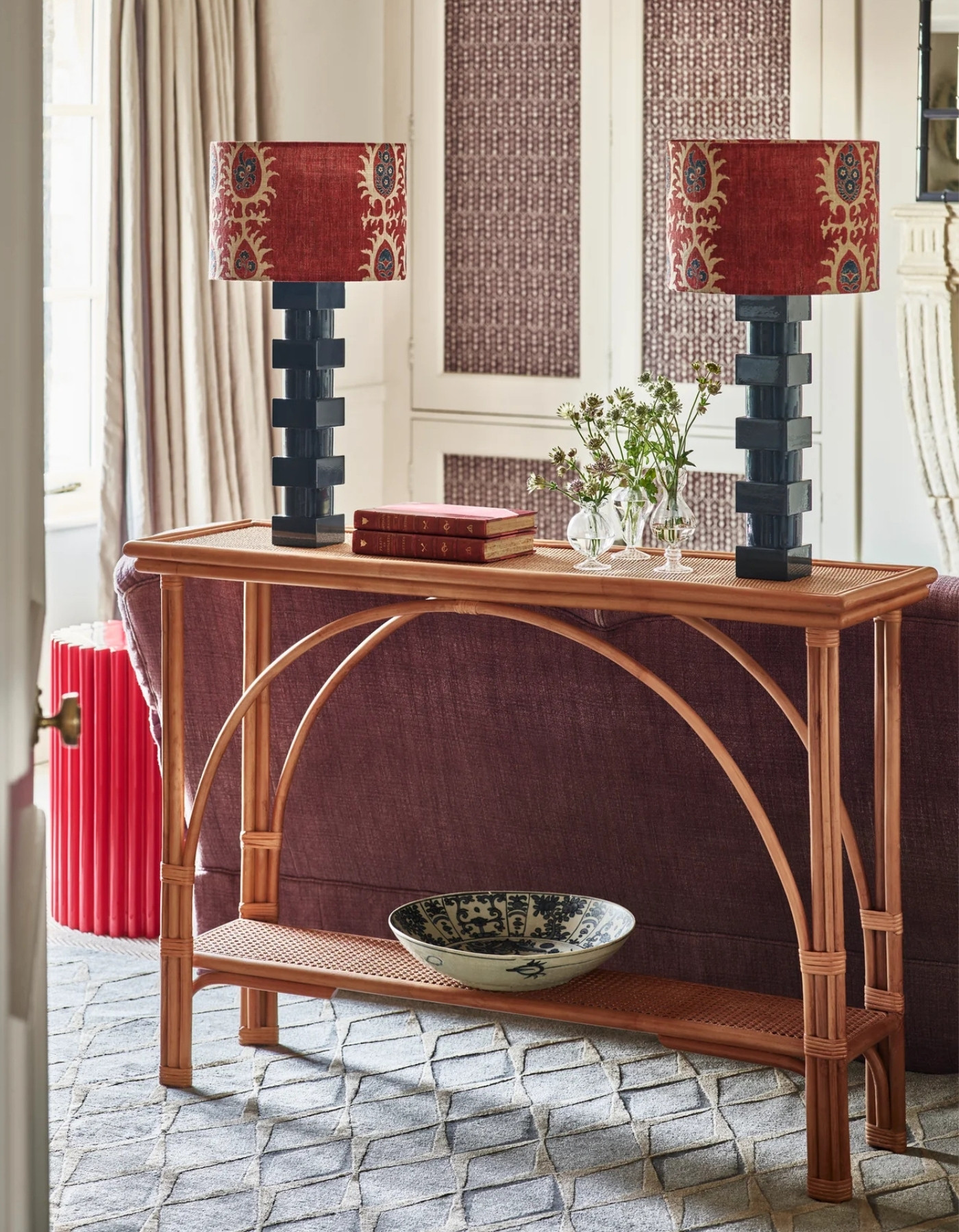The Sumba Arch Console by Charles Orchard is a bold yet refined expression of form and balance. Crafted from Natural Rattan and hand-curved with precision, its dramatic arches and clean lines evoke a sense of strength softened by artisanal grace. It features a flat rattan weave on top long with a honeycomb rattan shelf below.